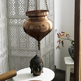 „Shirodhara je jedna z ajurvédských terapií, kdy jemným kontinuálním proudem oleje je „masírovaná“ oblast čela a vlasů tzv. třetí oko.“